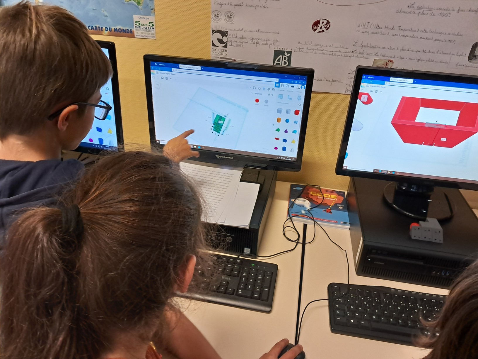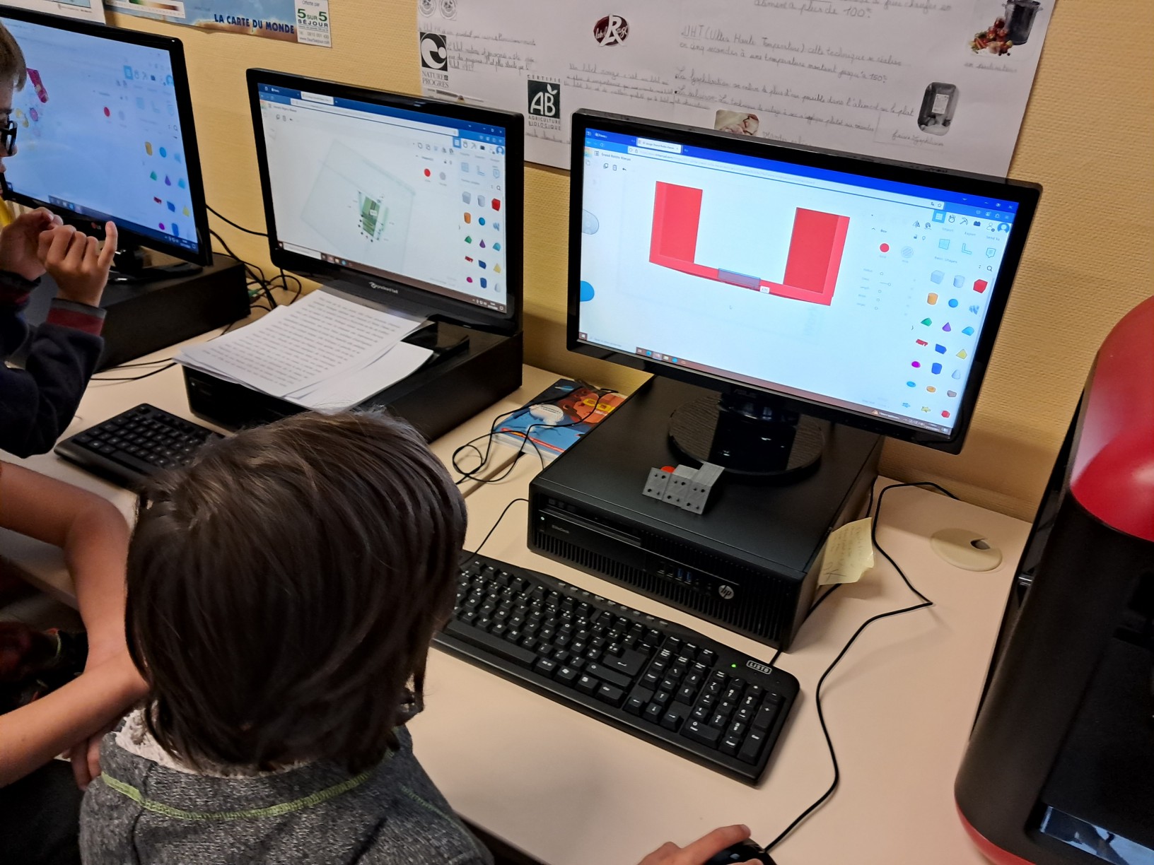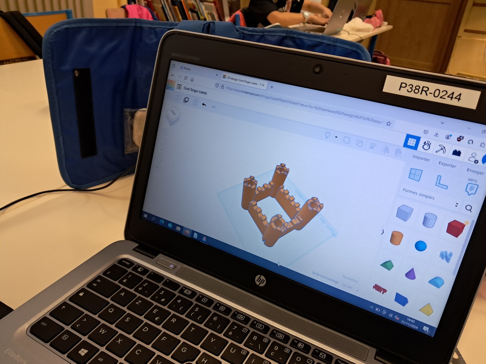Le deuxième exercice consistait à essayer de dessiner sur ce logiciel des pièces plus complexes qui doivent s’emboîter à 90°. On a fait beaucoup d'essais et il a fallu que plusieurs groupes partagent leurs expériences pour y parvenir mais une fois imprimées, quel plaisir de les voir se clipser l'une sur l'autre à la perfection.