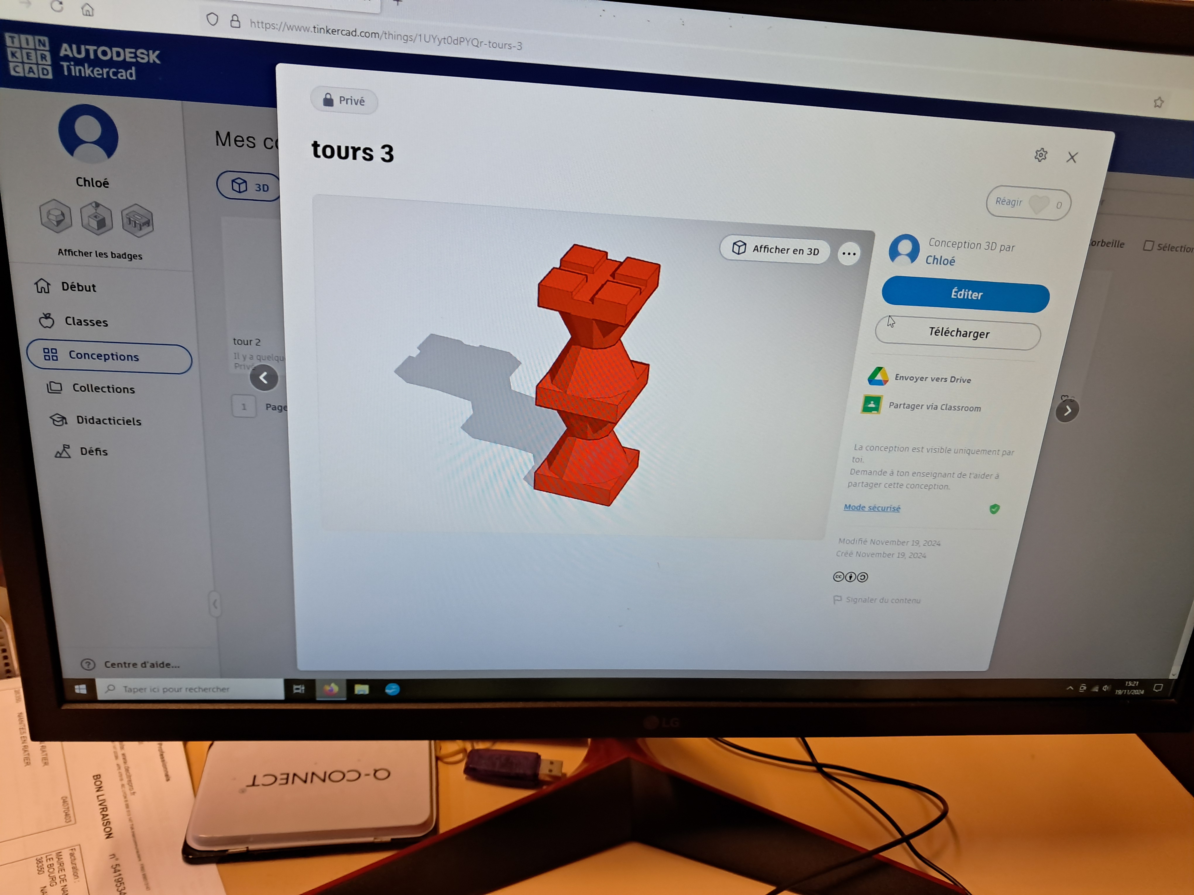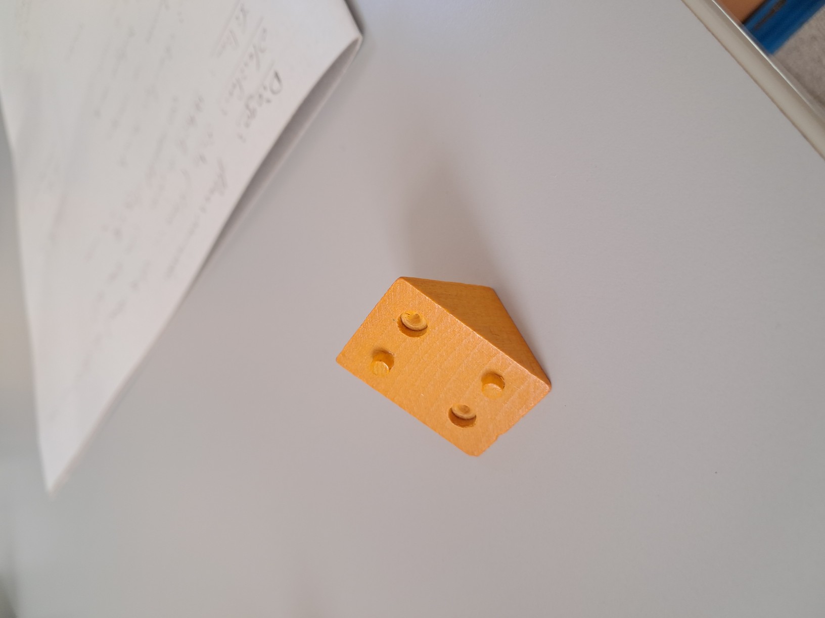 Le premier exercice était de reconstruire sur un logiciel une pièce d'un jeu qui a été perdue l'année dernière. C'était une pièce facile, un pavé droit. Quand nous l'avons imprimée, elle était trop légère par rapport aux autres pièces du jeu. Nous avons du faire des recherches pour trouver le bon réglage et obtenir une pièce imprimée qui fasse le même poids que celles du jeu.