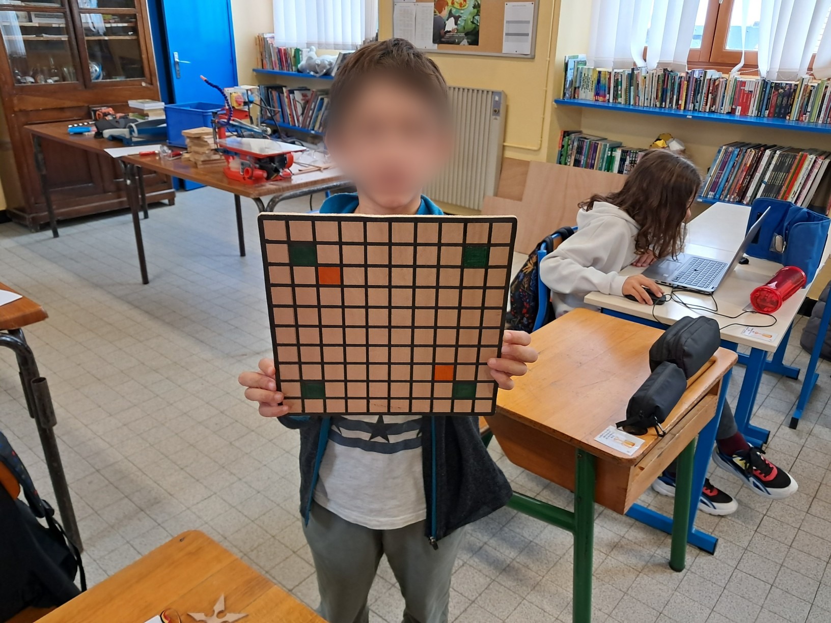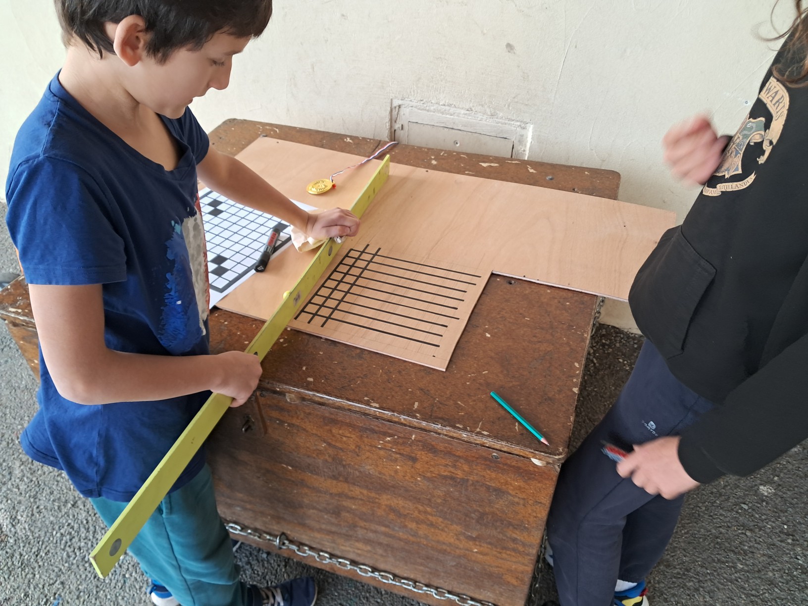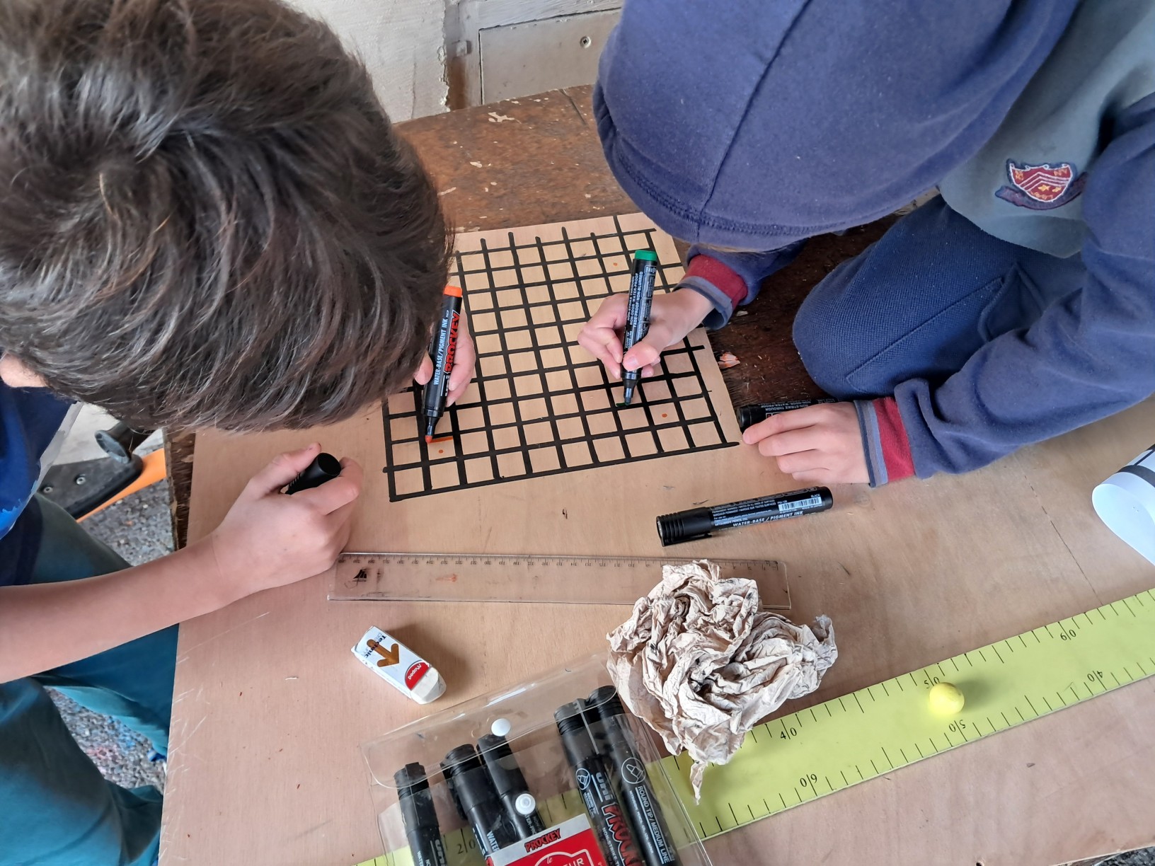 Enfin, le maître nous a proposé de créer le jeu du début à la fin. Nous avons donc créé nos propres pièces en impression 3D, nos propres plateaux de jeu tracés à la main et découpés à la scie à chantourner et nos propres boites en carton assemblées et décorées par nos soins. Il nous reste à rédiger les règles et les imprimer (sur une imprimante papier cette fois).