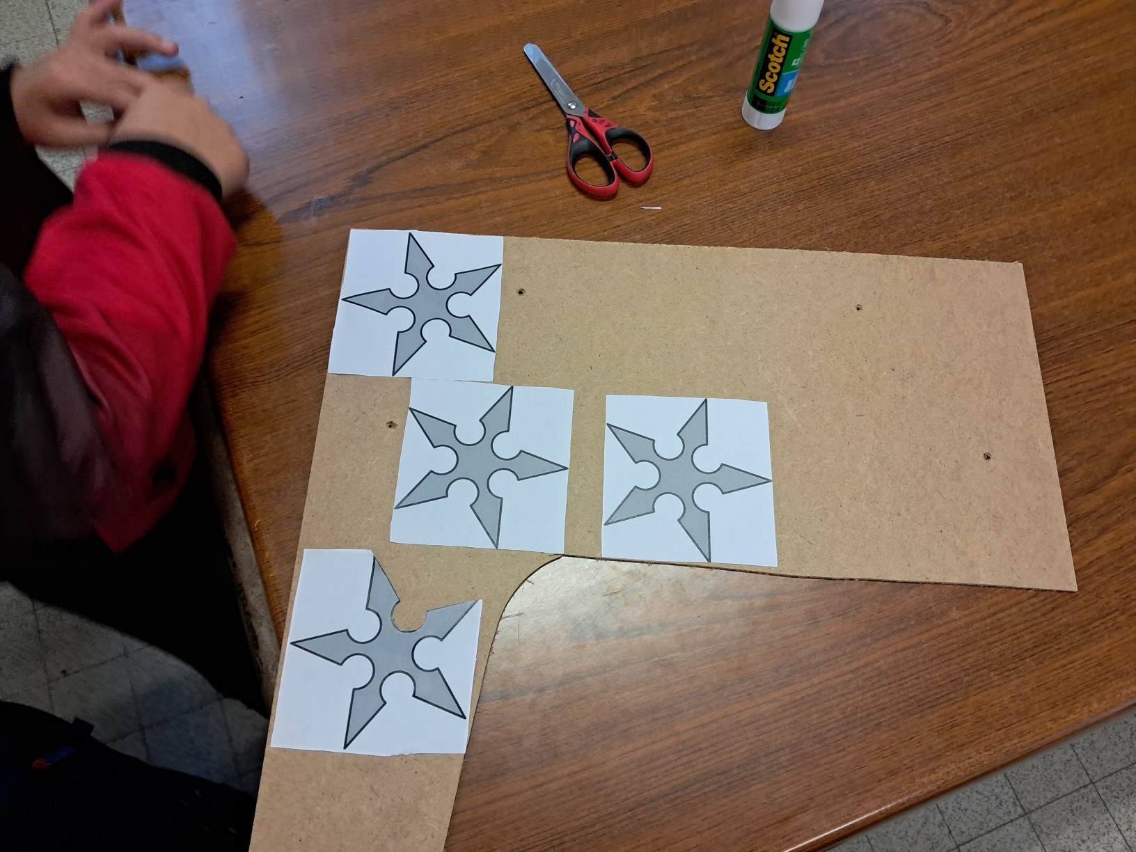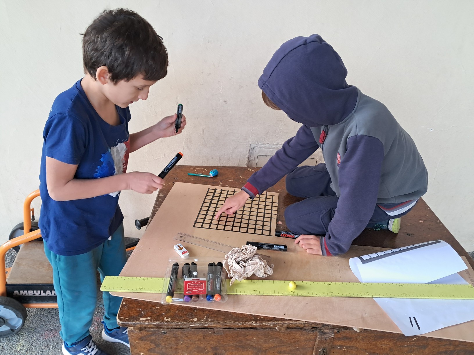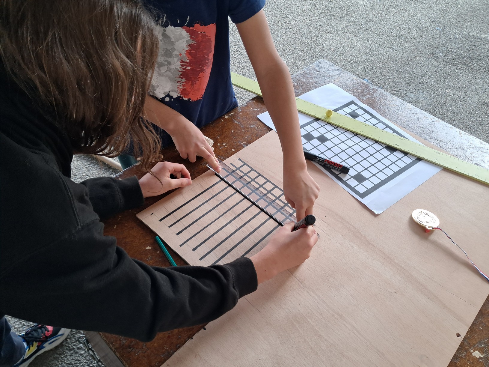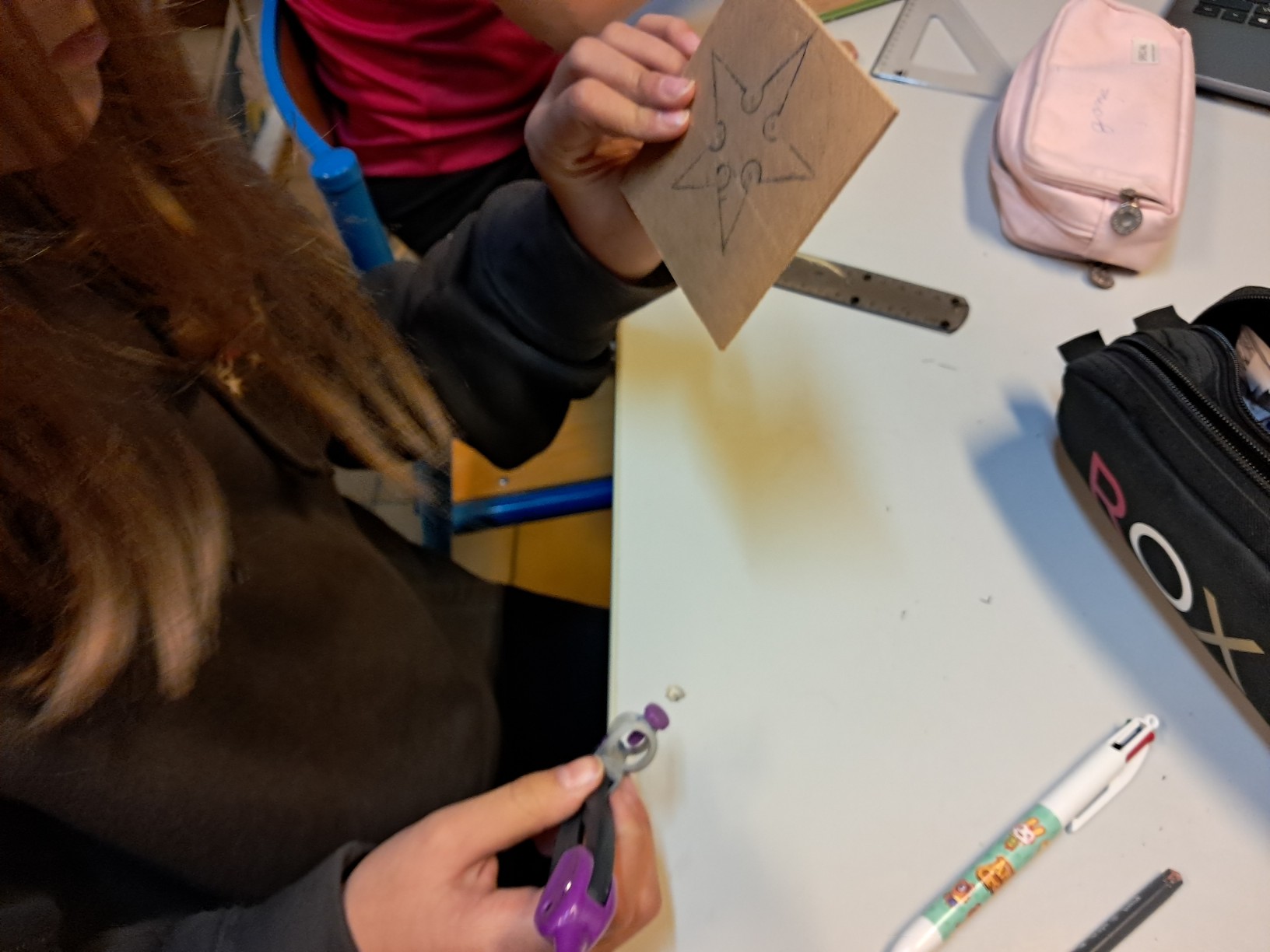 Enfin, le maître nous a proposé de créer le jeu du début à la fin. Nous avons donc créé nos propres pièces en impression 3D, nos propres plateaux de jeu tracés à la main et découpés à la scie à chantourner et nos propres boites en carton assemblées et décorées par nos soins. Il nous reste à rédiger les règles et les imprimer (sur une imprimante papier cette fois).