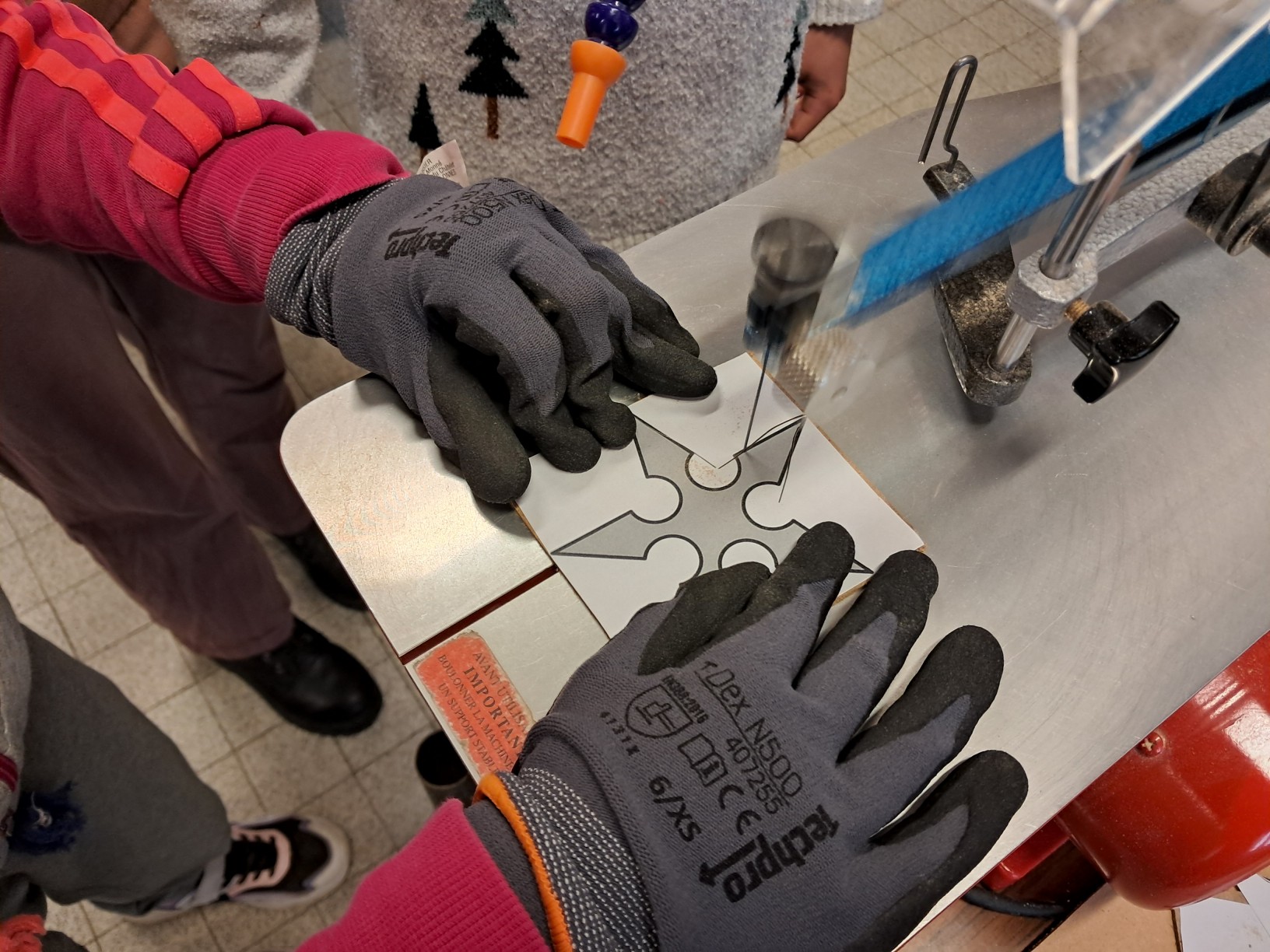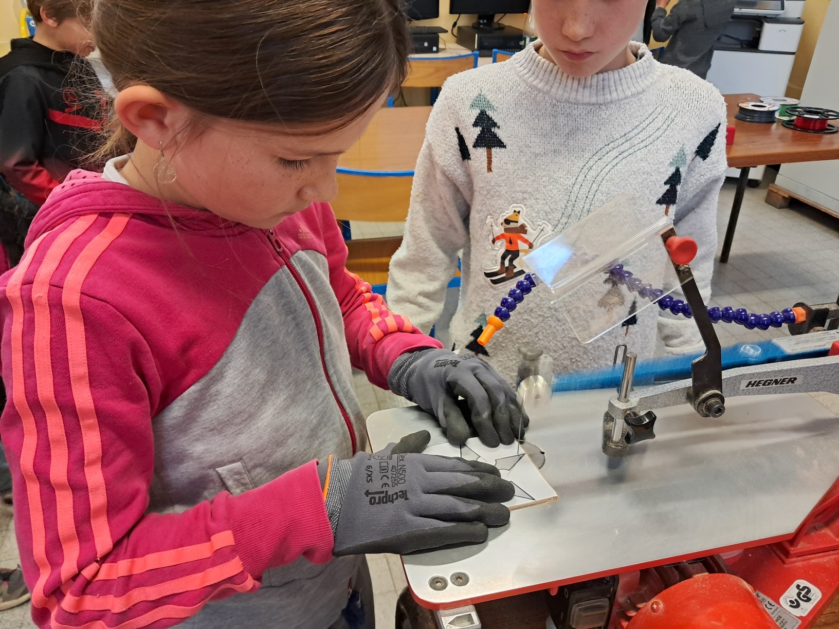 Nous avons aussi une scie à chantourner. Elle est fixée sur une table dans la classe. La scie est très fine, elle vibre très vite. On pose une planchette de bois sur la plate-forme de découpe et on pousse (ou on tourne) la planchette pour que la scie la découpe sur le trait que l'on a dessiné. Il y a des risques de coupures ou de projection alors on porte des lunettes et des gants et on travaille toujours à deux. Un élève découpe pendant que l'autre surveille et peut arrêter la machine en urgence en cas de problème.