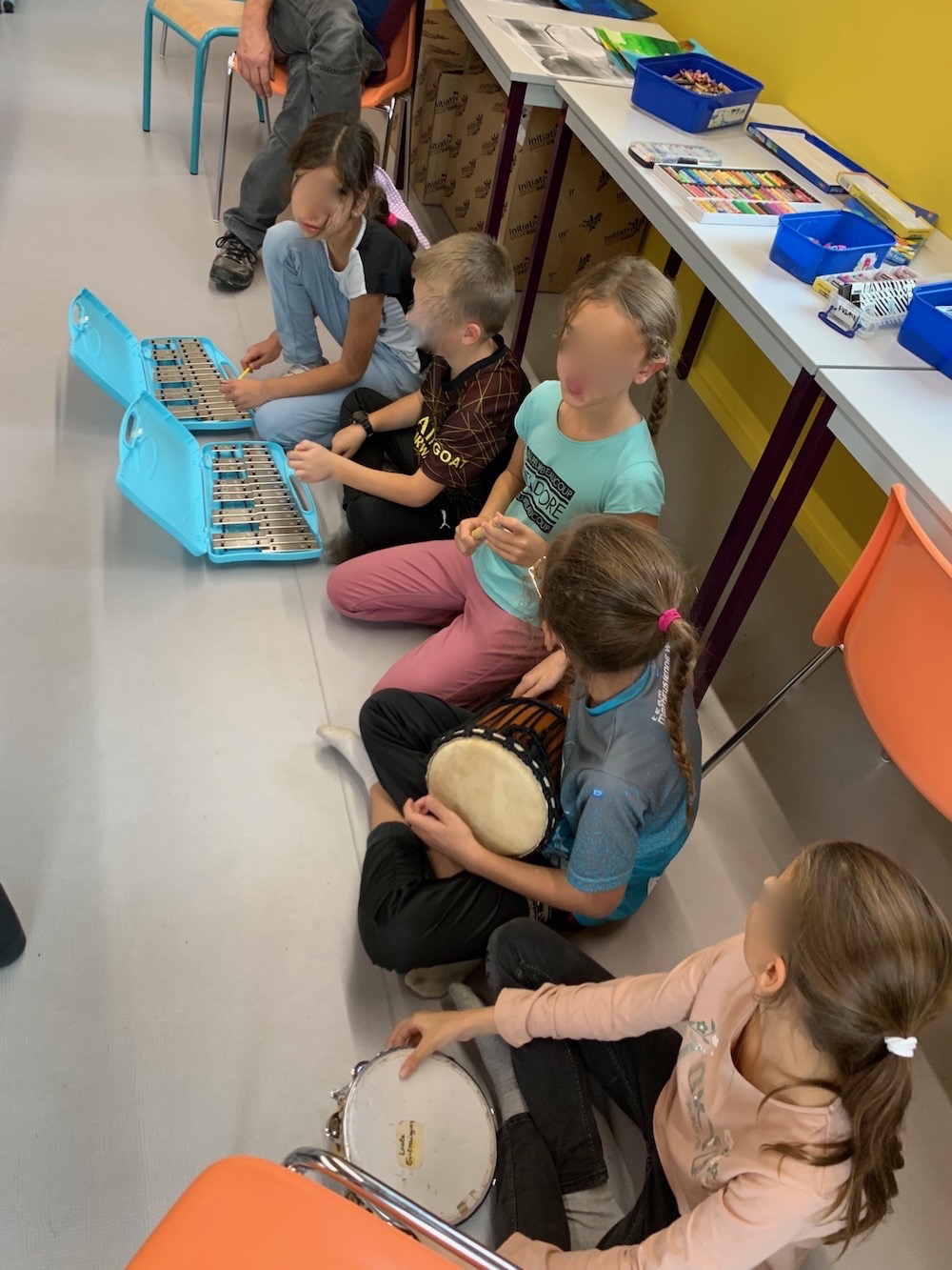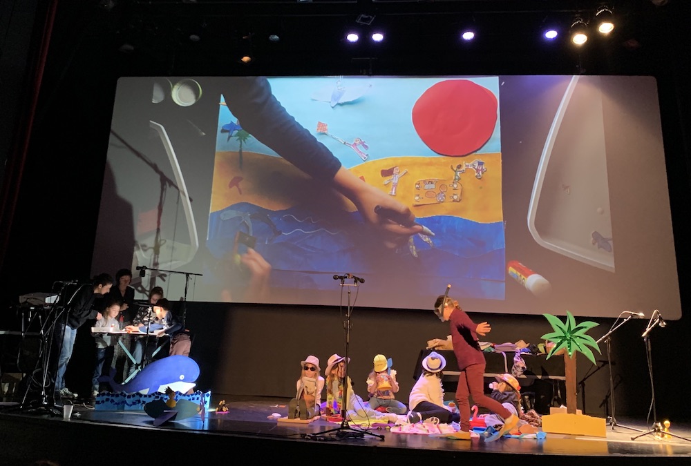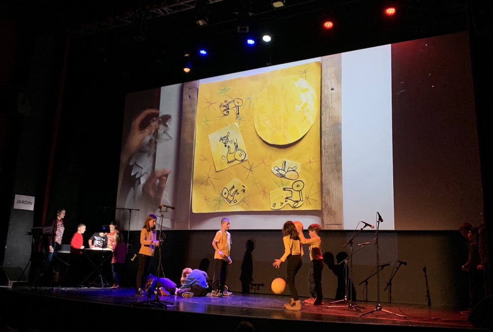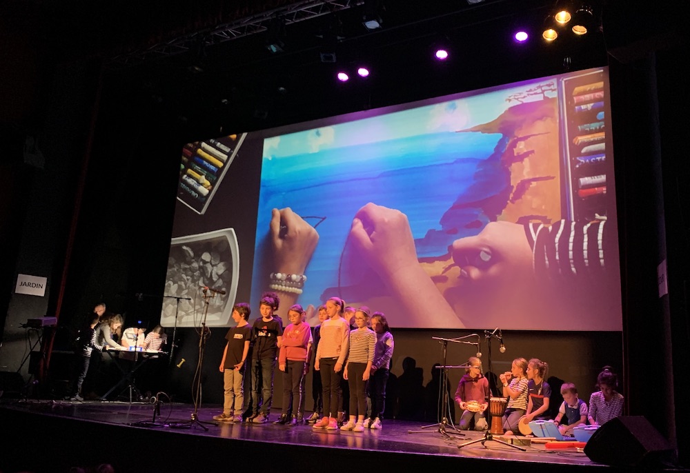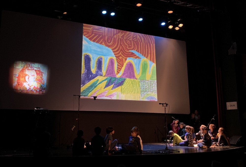 Quatre classes Émala Matheysine (CM1/CM2 d’Entraigues, CE1/CE2/CM1/CM2 de La Motte Saint Martin, CE1/CE2/CM1/CM2 de Nantes en Rattier et CE2/CM1/CM2 de Saint Laurent en Beaumont) ont appréhendé la démarche de création artistique coopérative pour créer un concert dessiné : dessiner, peindre, découper, et chanter, bruiter, jouer tout en même temps.